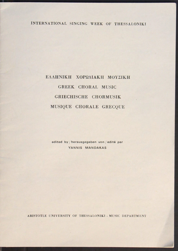 Tόμος που περιλαμβάνει διάφορα χορωδιακά έργα ελλήνων συνθετών. Στις σελίδες 9 - 13, το τραγούδι «Μια Σμυρνιά στο παραθύρι...» (Andantino mosso) [Αιγαίου / Λαμπελέτ 59] του Γιάννη Κωνσταντινίδη.
