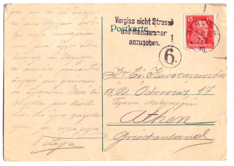 Card Postal προς Ευαγγελία Κωνσταντινίδου 20/10/1927