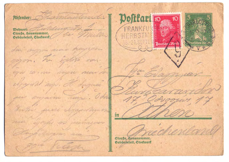 Card Postal προς Ευαγγελία Κωνσταντινίδου 15/09/1927